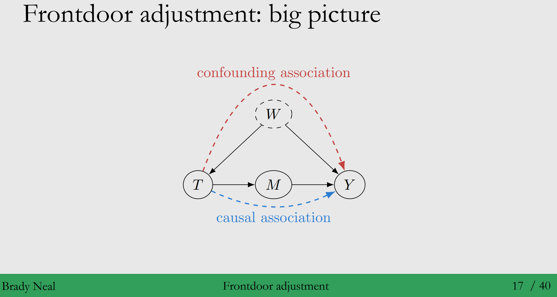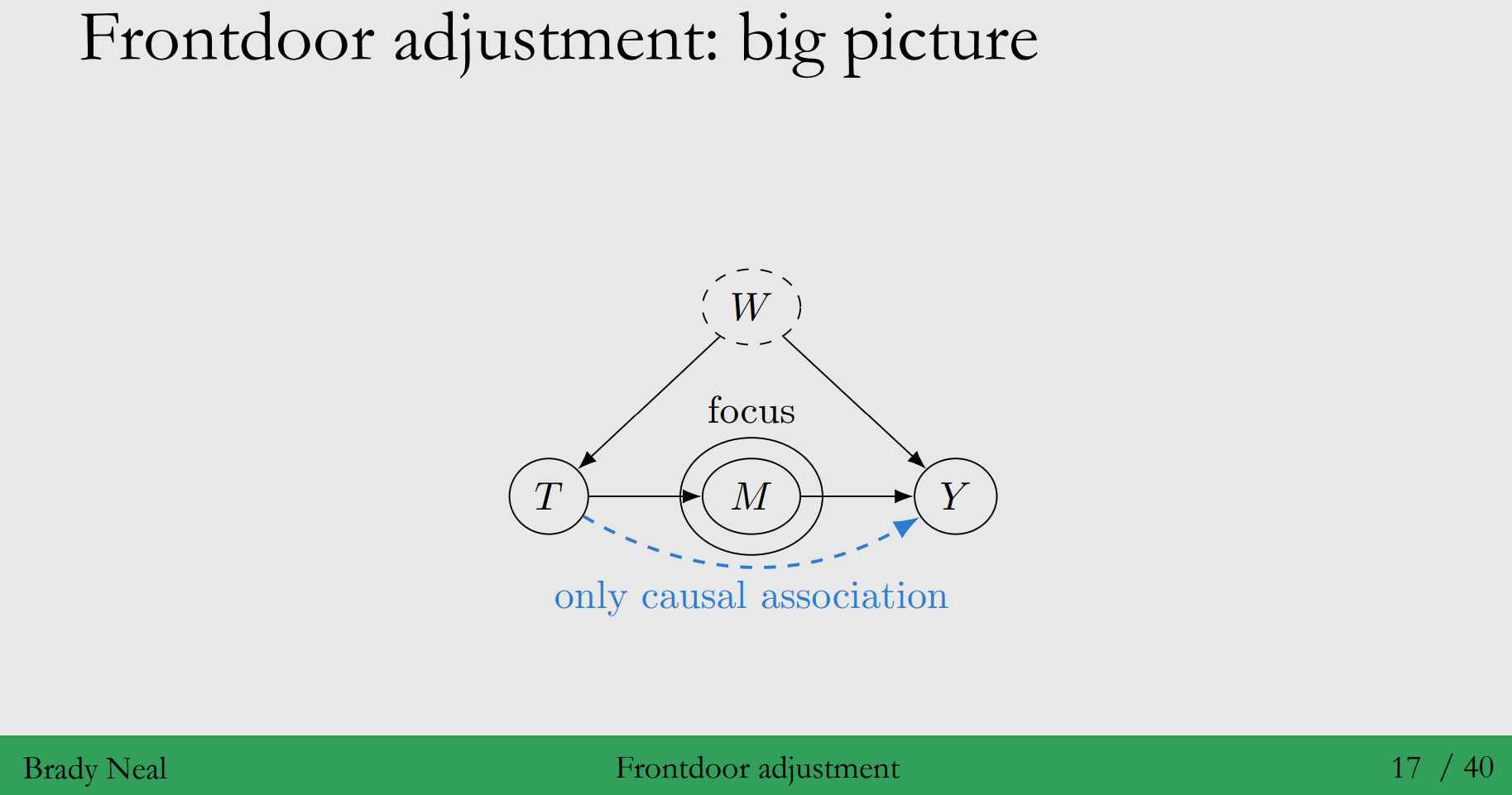 ◦ 직관 : - 아래 그림에서 Backdoor path는 $T → W → Y$의 Confounding association 입니다. - 우리가 관심이 있는 Causal association이 $M$를 통하고 있습니다. → $M$에 집중하면, Causal association을 분리할 수 있습니다.