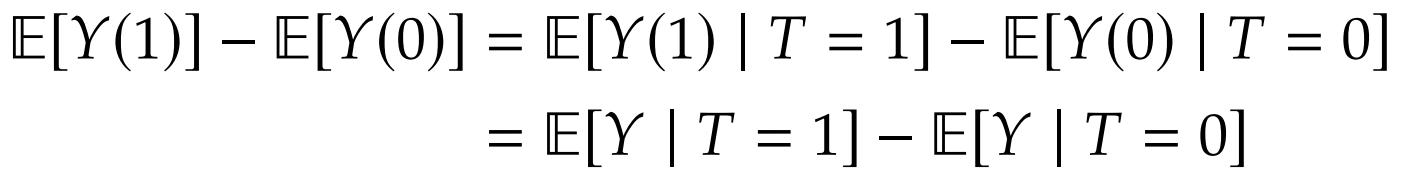 ◦ 처치 여부에 대한 랜덤화 : 처치 집단과 통제 집단의 다른 모든 조건을 같게 만들고(confounders 분포를 포함), 딱 하나 처치 여부만 다르게 합니다. → 따라서 처치 집단과 통제 집단의 결과에 차이가 생길 경우 이를 처치 여부 때문이라고 할 수 있게 됩니다. ◦ 처치 여부를 랜덤화 하는 것은 unobserved covariates까지도 covariate balance를 갖게 하는 효과를 가집니다. 그렇기 때문에 $T$가 $X$에 의해 결정되지 않아요. ($T {\perp \!\!\! \perp} X$) $$P(X|T=1)\stackrel{d}{=}P(X) \quad and\quad P(X|T=0)\stackrel{d}{=}P(X)$$