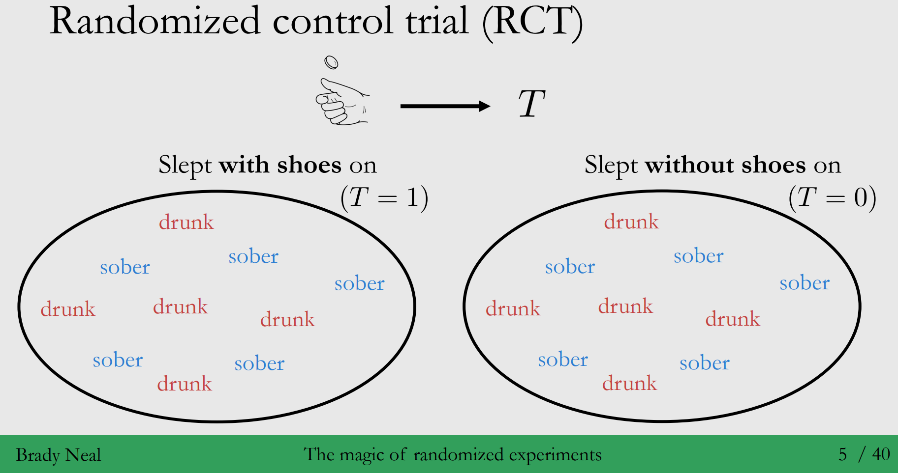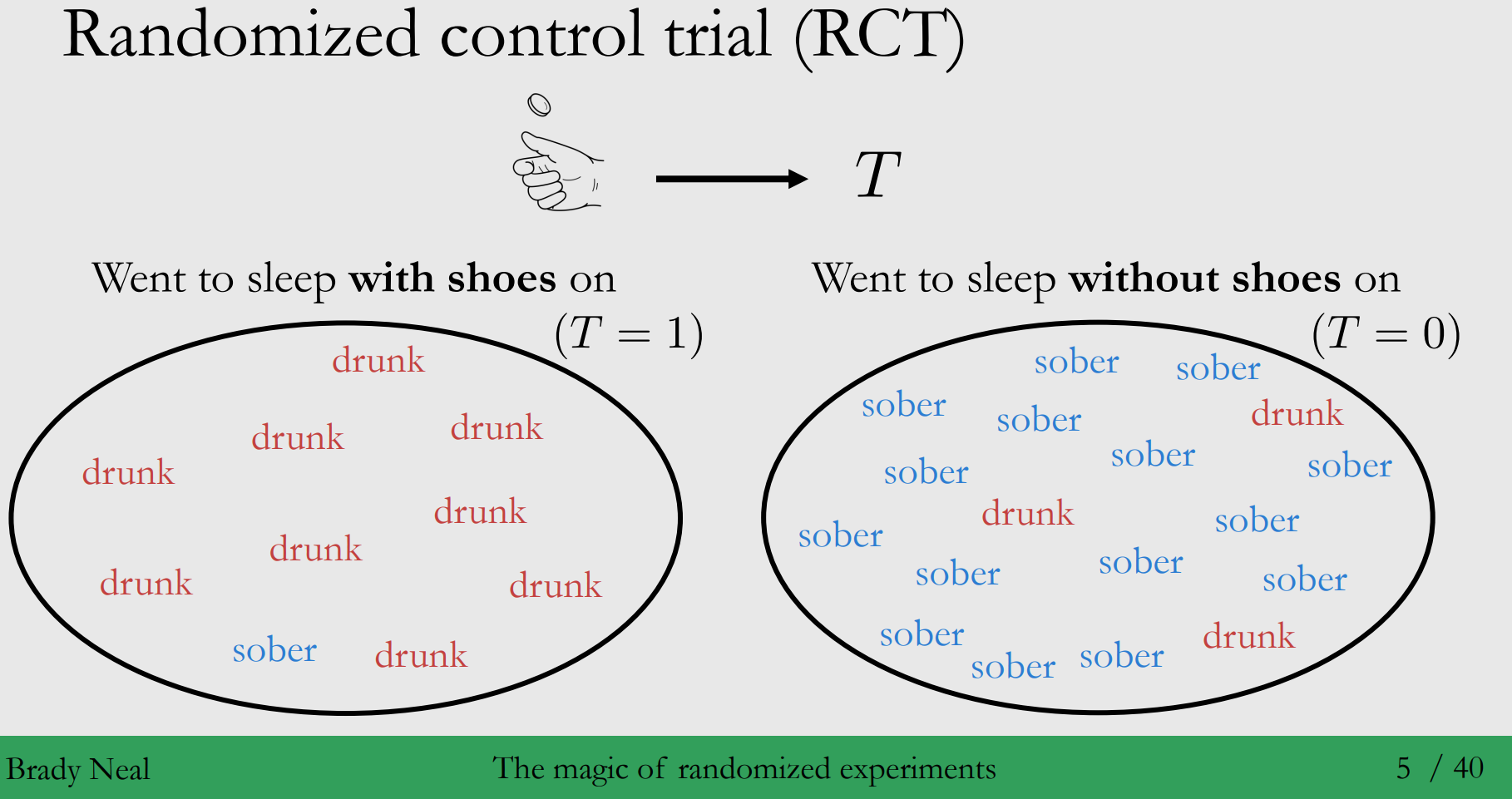 ◦ Randomized experiment : 신발을 신고 잘지 벗고 잘지 여부를(treatment를) 동전 던지기로 결정합니다. ⇒ 동전 앞뒷면이 나올 확률이 같으므로, 신발 신은 그룹과 벗은 그룹 내 전날 술에 취한 사람의 비율이 거의 같아지게 됩니다!