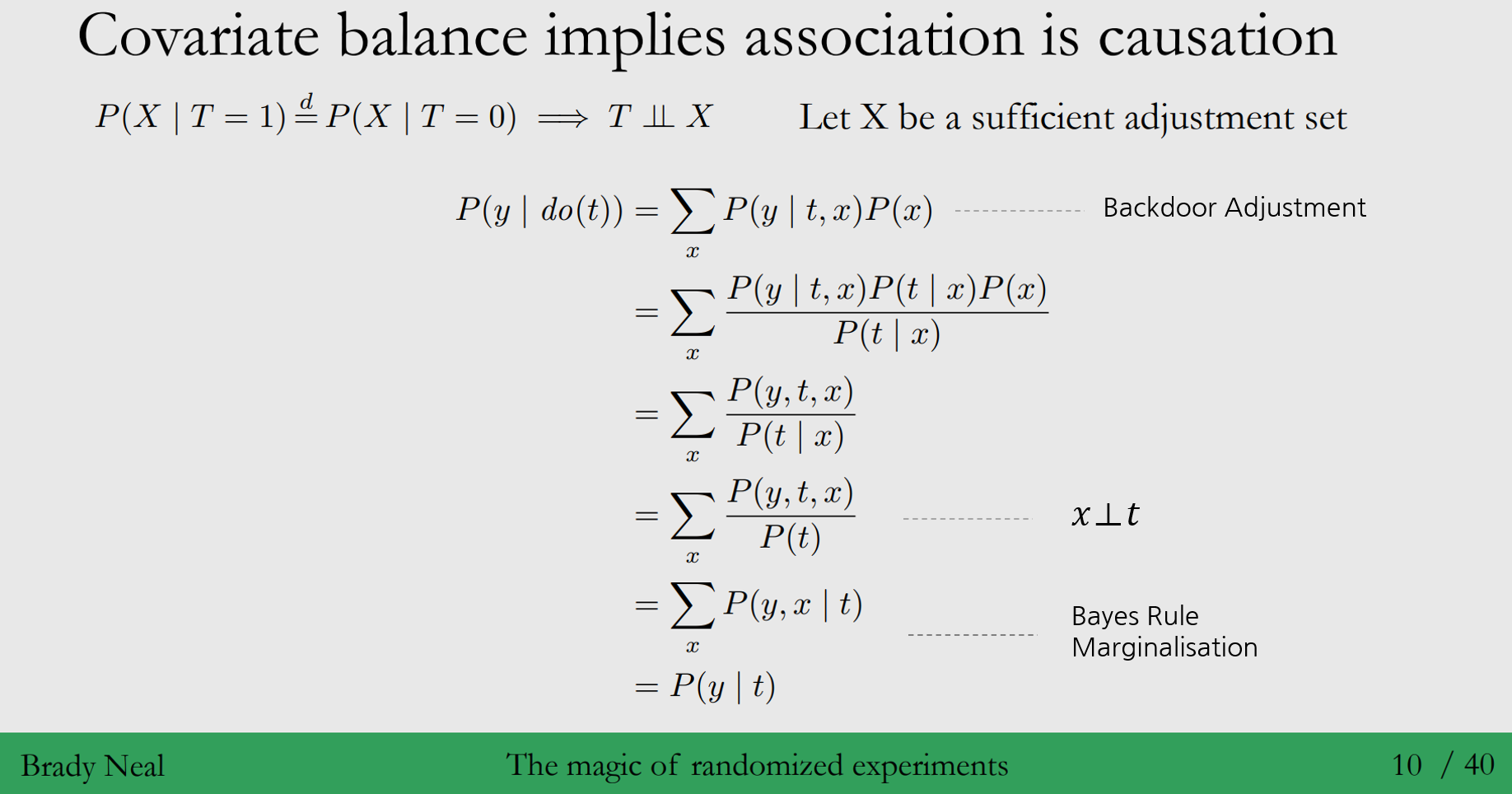 ◦Covariate balance에 대한 부분을 $P(y|do(t)) = P(y|t)$을 통해 증명할 수 있는데요. 과정은 아래와 같습니다.
