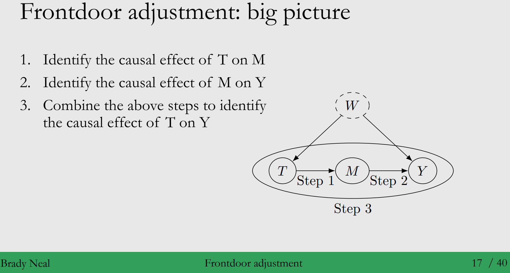 0. Frontdoor Adjustment 과정 ◦ $T → M$에 대한 인과 효과 Identify ◦ $M → Y$에 대한 인과 효과 Identify ◦ 앞의 2개의 스텝을 합쳐서, $T→ Y$에 대한 인과 효과를 Identify