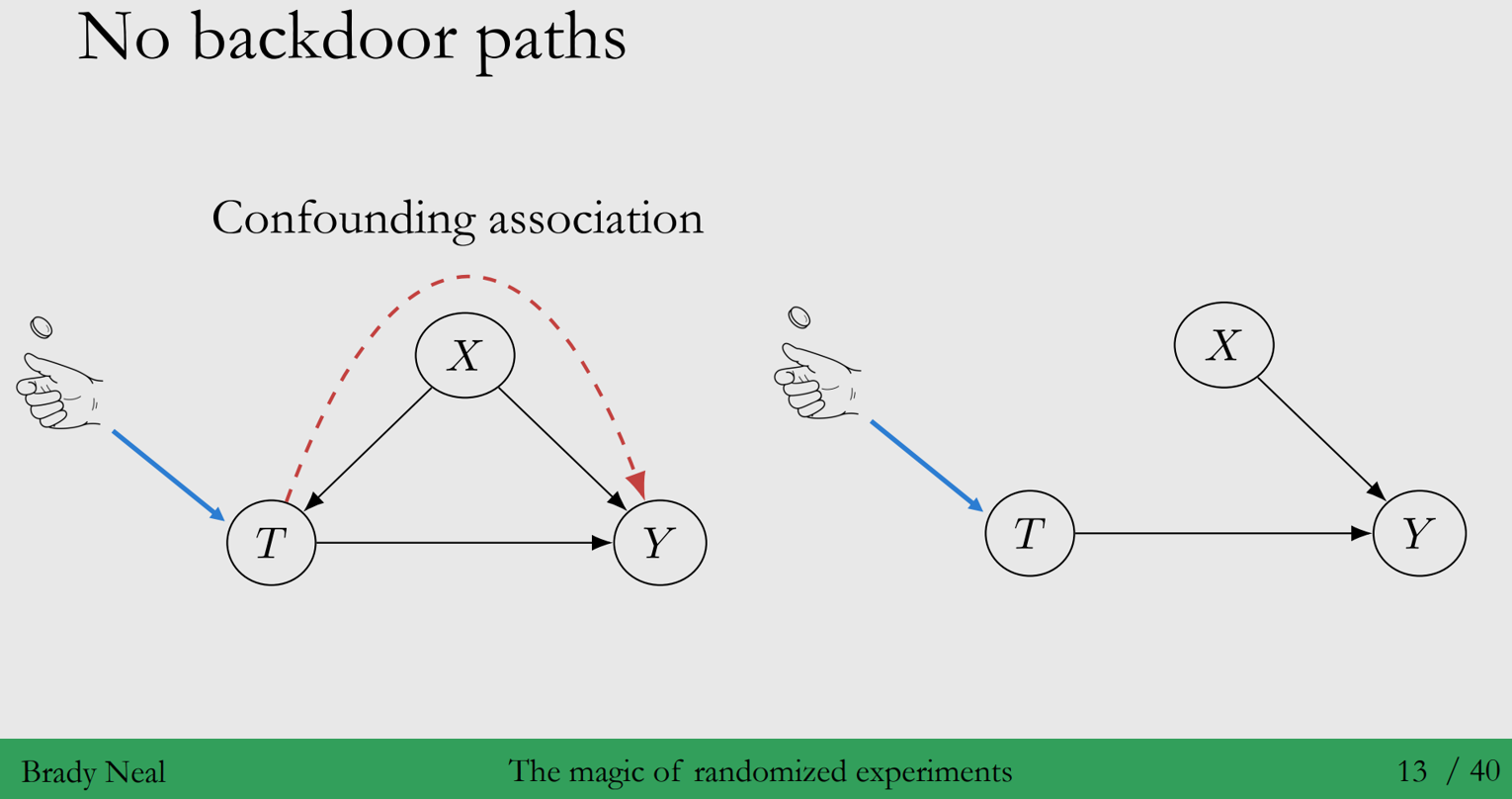 ◦ T를 randomize하면 T는 더이상 인과적 parents를 가지지 않게 됩니다. - $X$ → $T$로 가는 edge가 사라져서 backdoor path가 끊김 - Unobserved variables도 마찬가지로 path가 끊김