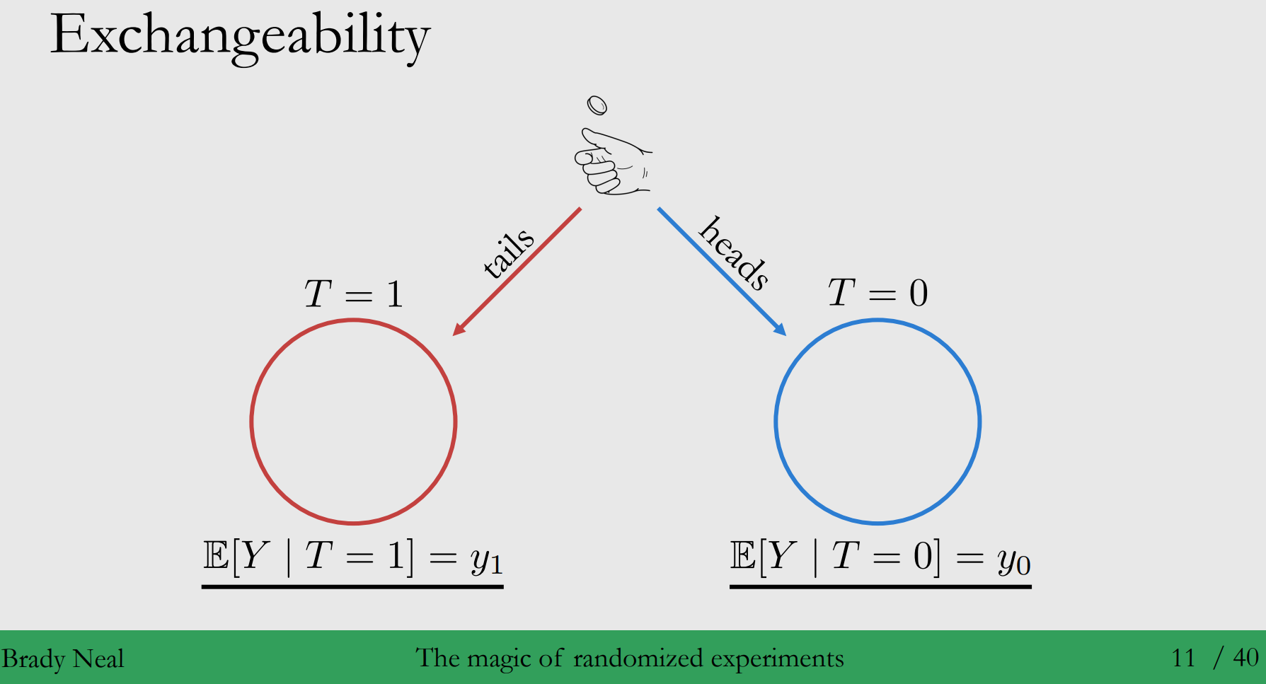 ◦ Treatment/Control 그룹이 교환 가능 : 앞면이 나온 사람을 처치 집단에 넣기로 하든 뒷면이 나온 사람을 처치 집단에 넣기로 하든 각 그룹의 Y에 대한 기댓값은 같습니다.