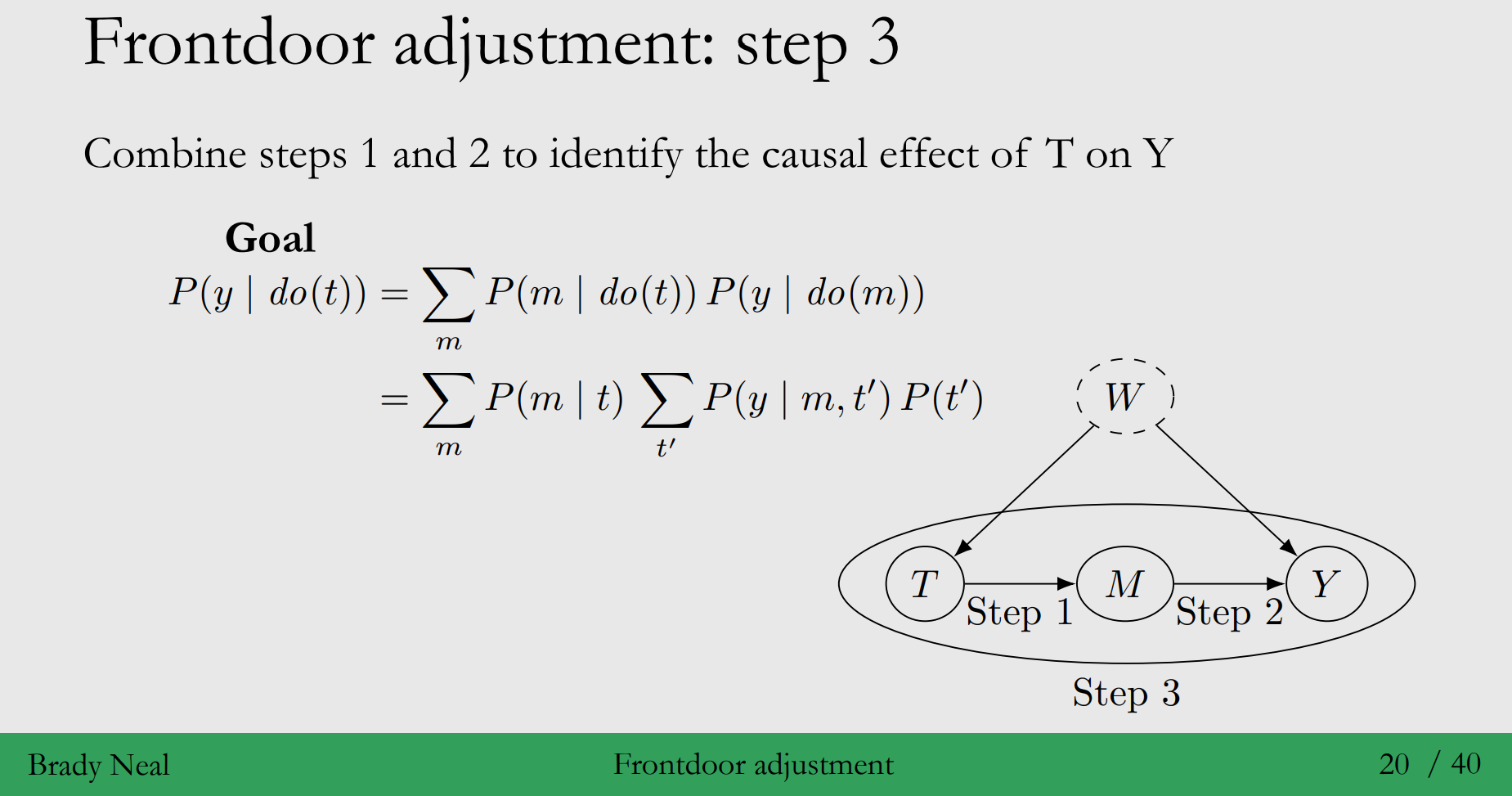 ◦ 만약 ($T$, $M$, $Y$)가 frontdoor criterion를 만족시키고, positivity를 가정한 경우, step1과 step2의 공식을 step3와 합친식은 아래와 같습니다. $$ P(y | do(t)) = \sum_mP(m|t)\sum_{t'}P(y|m, t')P(t') $$