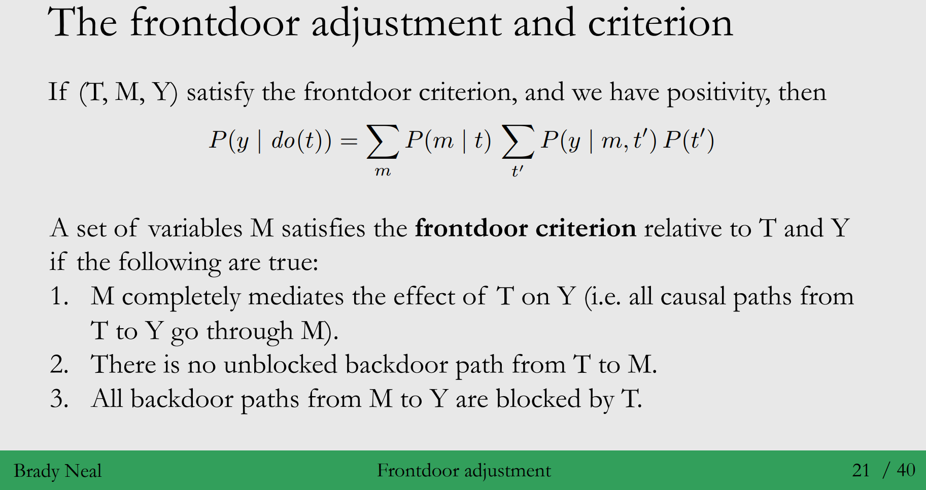 - $M$이 $T → Y$의 효과를 완전하게 매개 (complete mediation, 예시 : 모든 $T$에서 $Y$로 가는 causal path가 $M$을 지나는 경우) - $T$에서 $M$으로 가는 unblocked backdoor path가 없음 - $M$에서 $Y$로 가는 모든 backdoor path가 $T$에 의해서 blocked