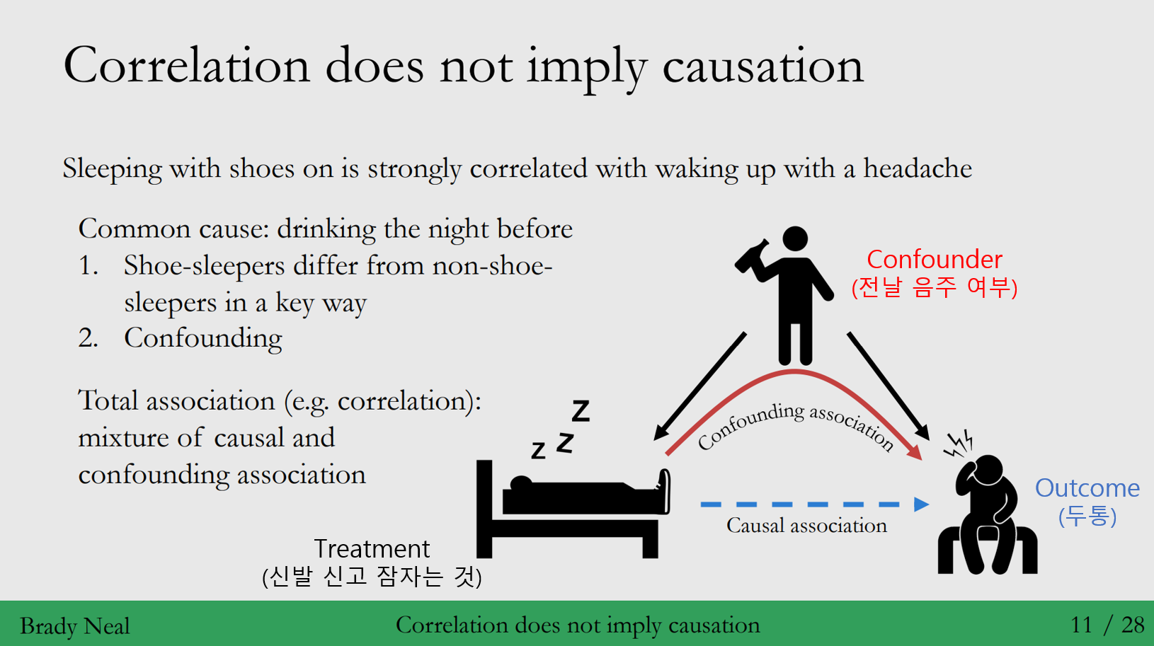 → 일어났을 때 두통이 있는 것($Y$)의 원인이 신발을 신고 잠에든 경우($X$)라고 결론을 내리려면,
