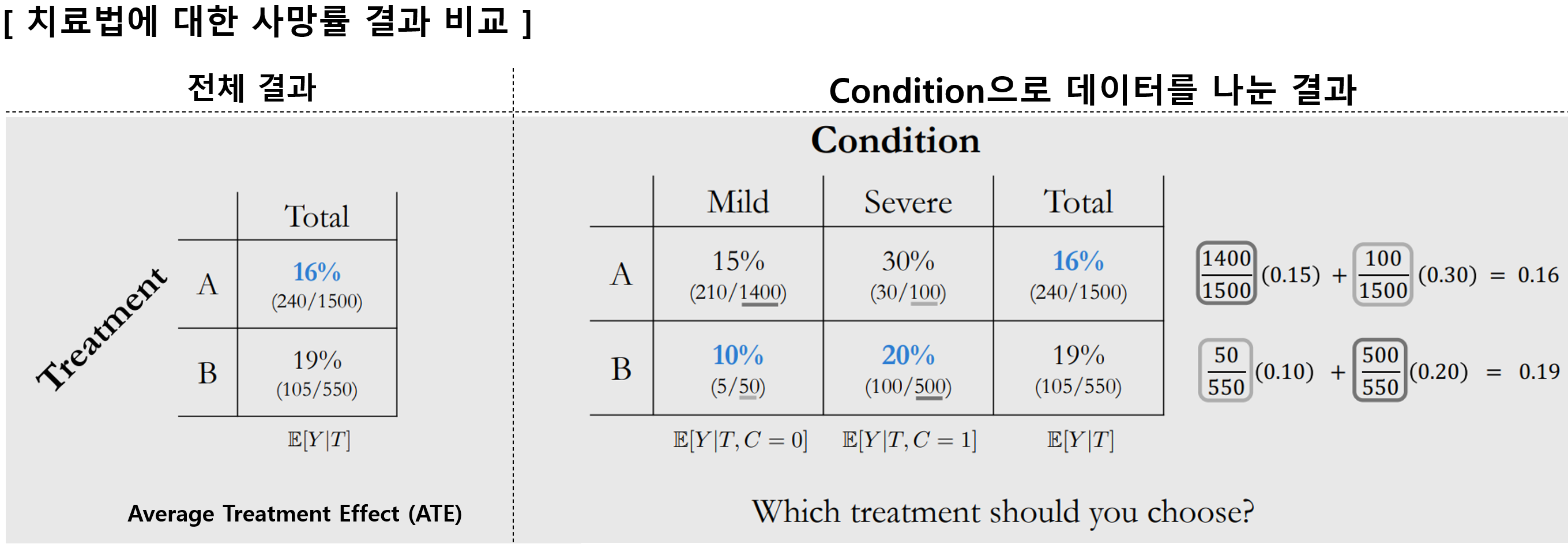 - Subgroup으로 나눠서 본 경우 : 각 환자 Condition별 사망율은 치료법 A가 B보다 높음
