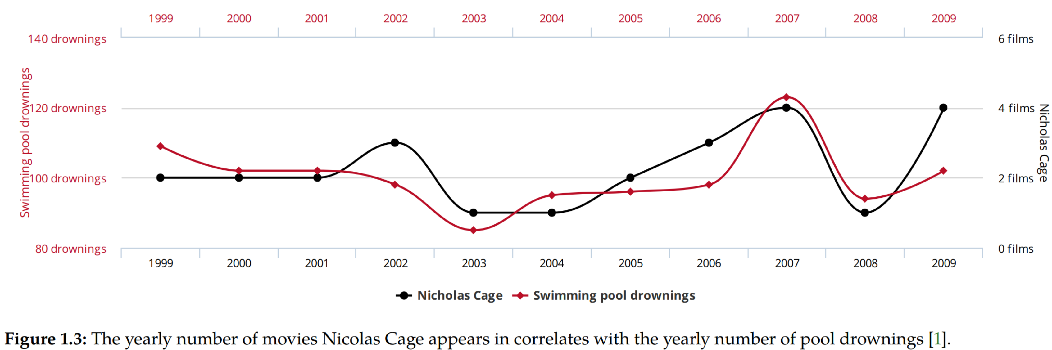 • 사례 1 : 연간 니콜라스 케이지의 영화 출현 횟수와 연간 익사 사망사고 건수