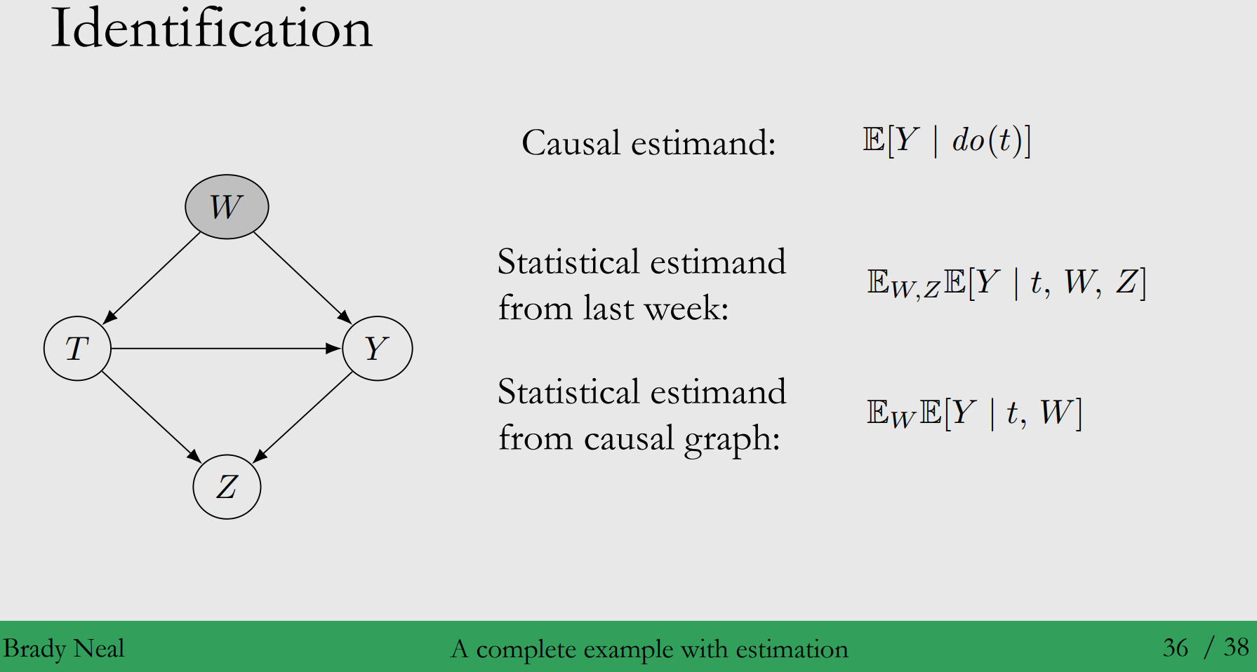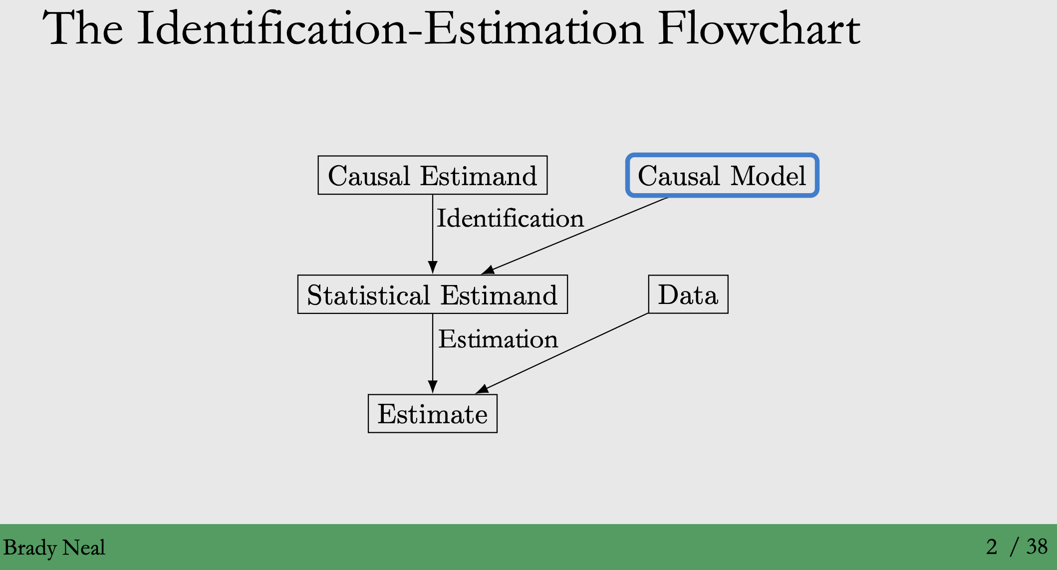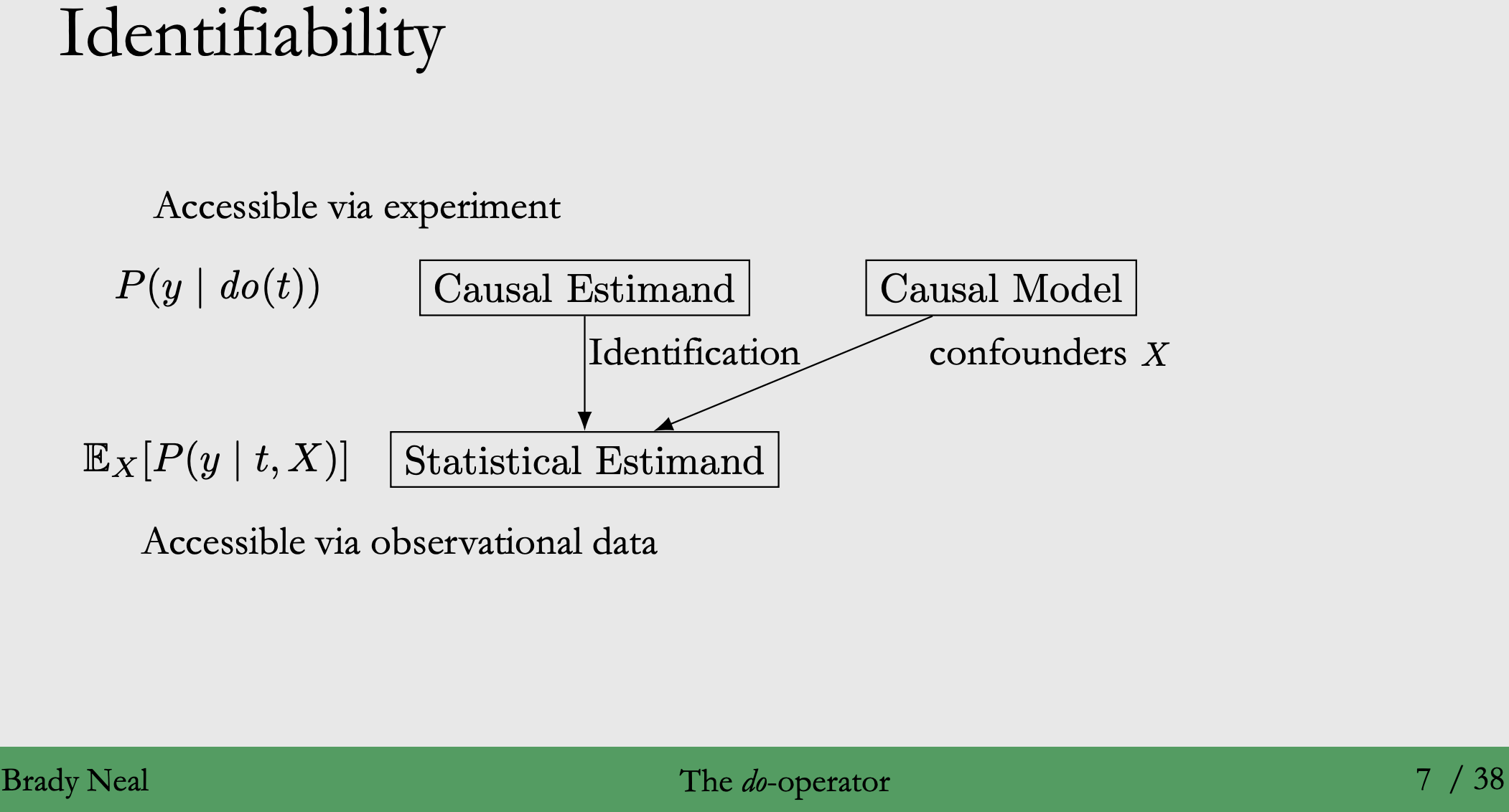 ◦ 정의 : 개입을 통해 얻은 Causal Estimand를 Identification 가정을 통해 Statistical Estimand로 바꾸는 과정 (직접 계산할 수 없음, Counterfactuals) (직접 계산가능) → 이 때, Confounders $X$를 제어하는데 필요한 Causal Models의 요소를 이번 Chapter에서 배울 예정입니다!