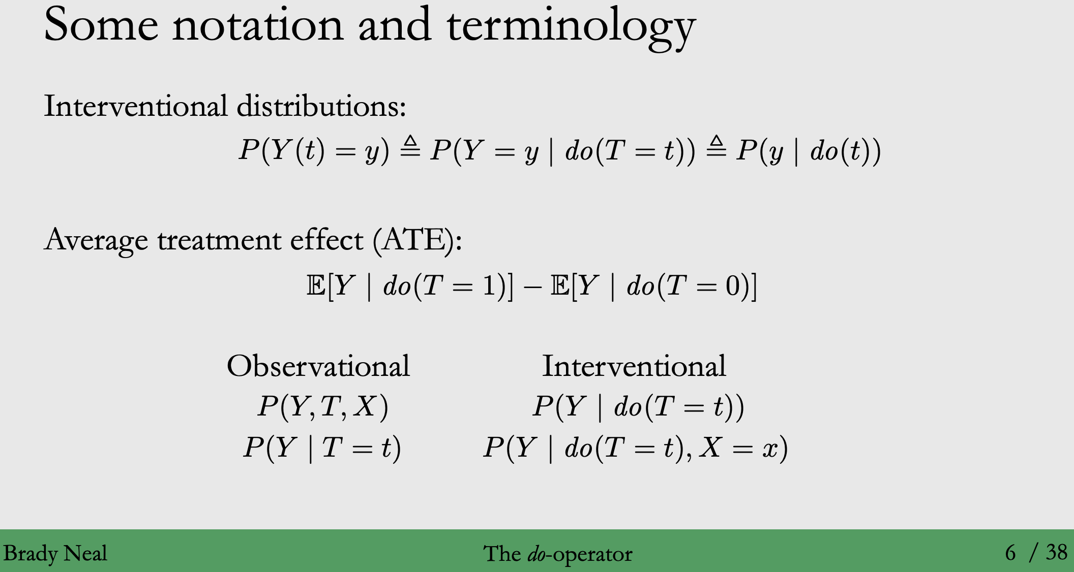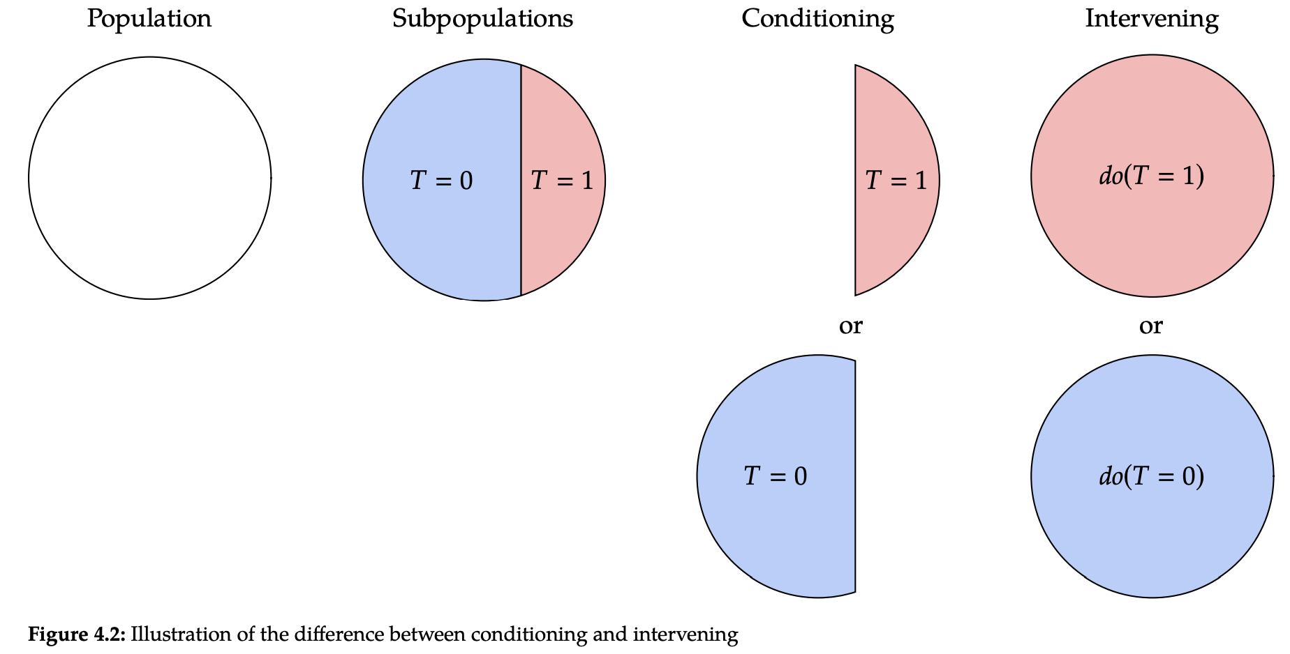 ◦ Conditioning on $T=t$ : 전체 모집단 or 관측한 데이터에서 Treatment $t$를 받은 모집단의 부분 집합에 해당합니다. ◦ Intervention on $T=t$ : 처치한 부분 집합이 아닌, 전체 모집단에 대해서 $T=t$ 로 설정한 것을 말합니다. - 통상적으로 Intervention은 $do(T=t), do(t)$로 표현합니다. - 이는 주어진 현상을 그대로 관찰하는 것이 아닌, Doing(개입)한다라는 의미로 이해할 수 있습니다.