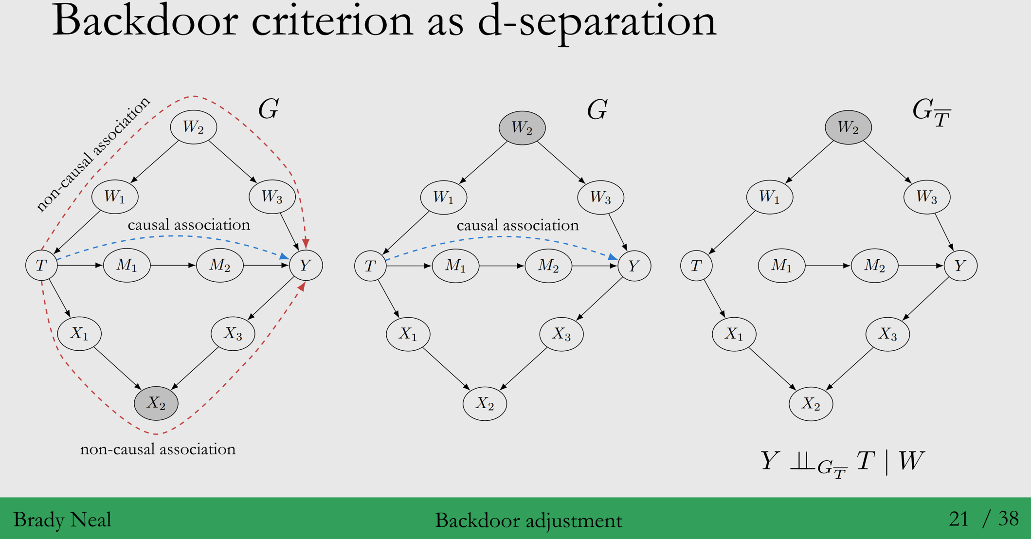 1. Backdoor criterion < 왼쪽 그림 > - 조건 1. 집합 $W$는 $T$에서 $Y$로 가는 모든 backdoor paths를 막아야합니다. 열려 있는 Backdoor path는 $W_2$ or $W_1$→ Blocked - 조건 2. 집합 $W$는 $T$의 어느 자손도 포함하지 말아야 합니다. $T$의 자손인 $X_2$가 막혀 있습니다. → Unblocked