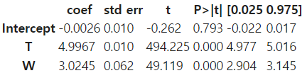Y = 5 * T + 3 * W + np.random.normal(size = num)