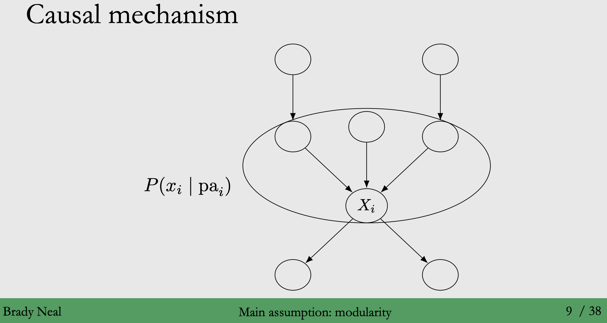 ◦ 의미 : 어떤 노드에 개입(Intervention)하게 되면, 개입으로 인한 변화가 local하다는 것입니다. ◦ 효과 : 즉, 개입한 노드 $X_i$에 대해서 부모 노드 $pa_i$가 미치는 영향만 변하고, 나머지 노드에서 주는 영향은 유지가 된다라는 것입니다. ◦ 예시 : 아래 그림에서, 해당 가정에 따르면 원 안에 있는 $X_i$의 부모 노드($pa_i$)가 미치는 영향만 변화하고, 나머지는 영향은 유지 됩니다.