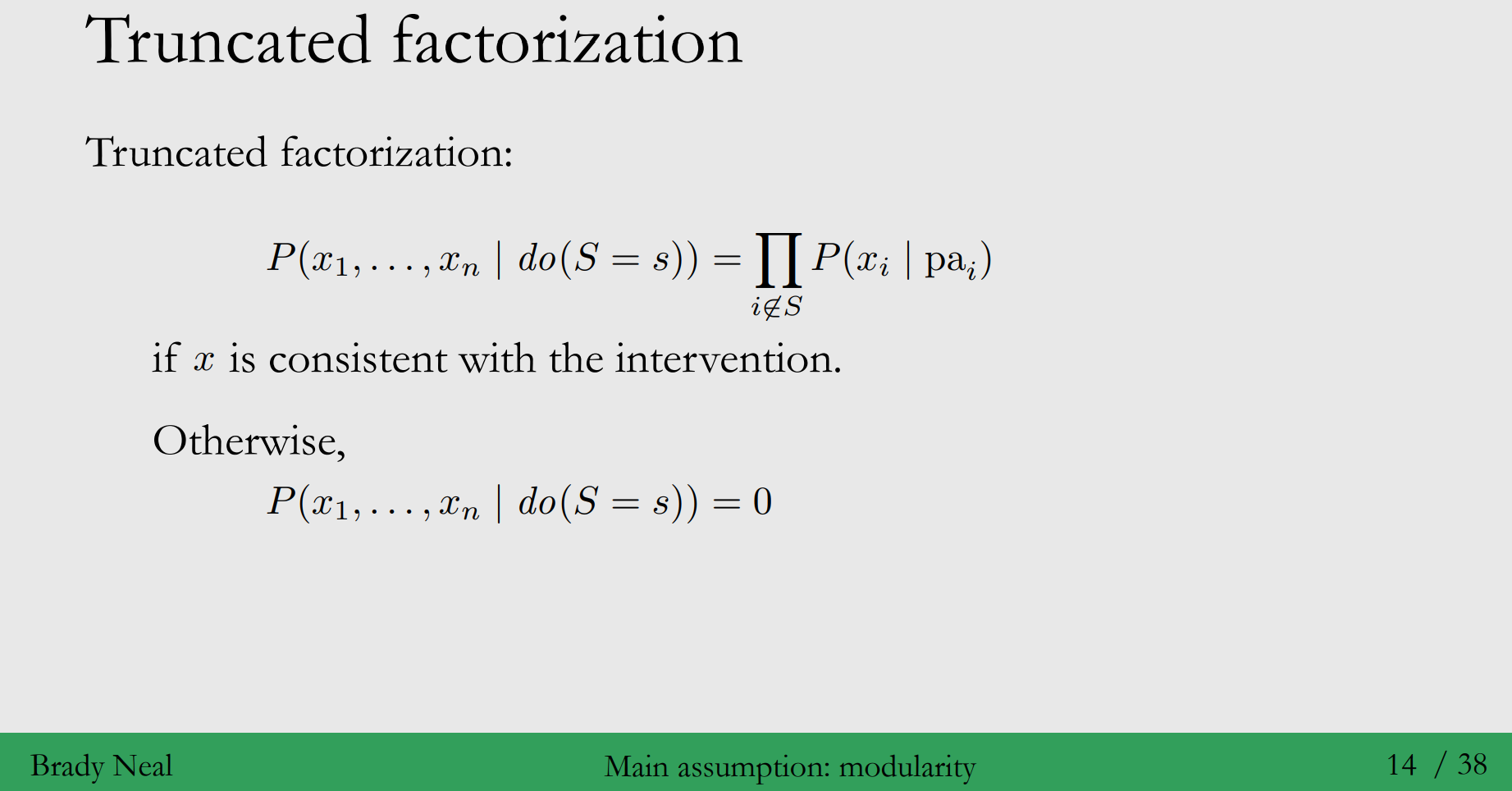 2. Modularity assumption 적용 여기서 개입(intervention)을 한 노드의 인덱스 집합을 S라고 한다면, $i∈S$ 인 노드들에 대해서는, $P(x_i|pa_i)$ = 1이기 때문에, bayesian network factorization 계산 과정에서 생략이 가능합니다.