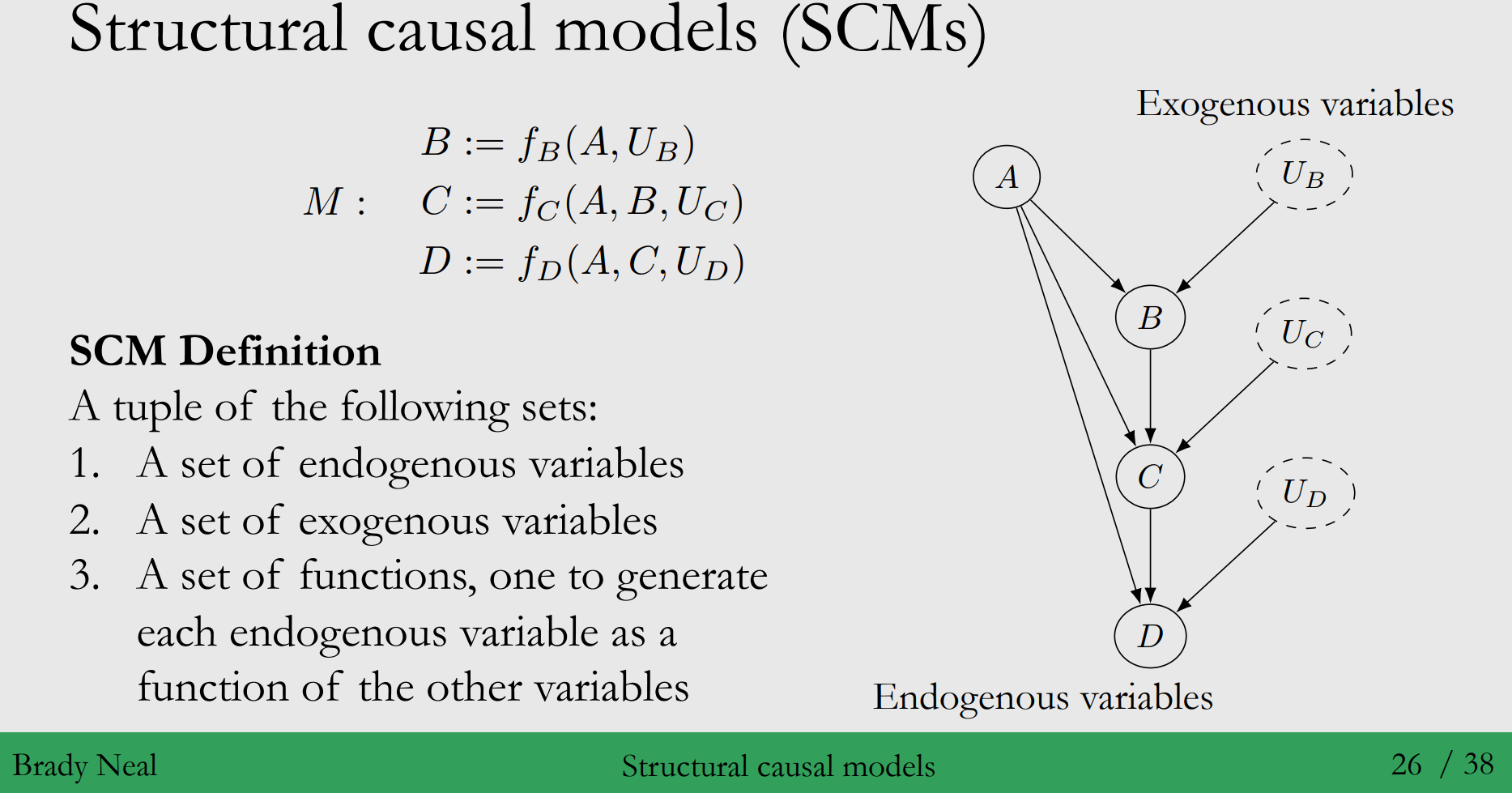 1.U : 외생(exogenous) 변수, 모델 밖에서 그 값이 결정되는 변수들의 집합 - 부모 노드가 없는 변수로 이 노드의 causes를 모델링 할 필요가 없습니다. - 아래 그림에서는 변수 $U_B, U_C, U_D$에 해당합니다.