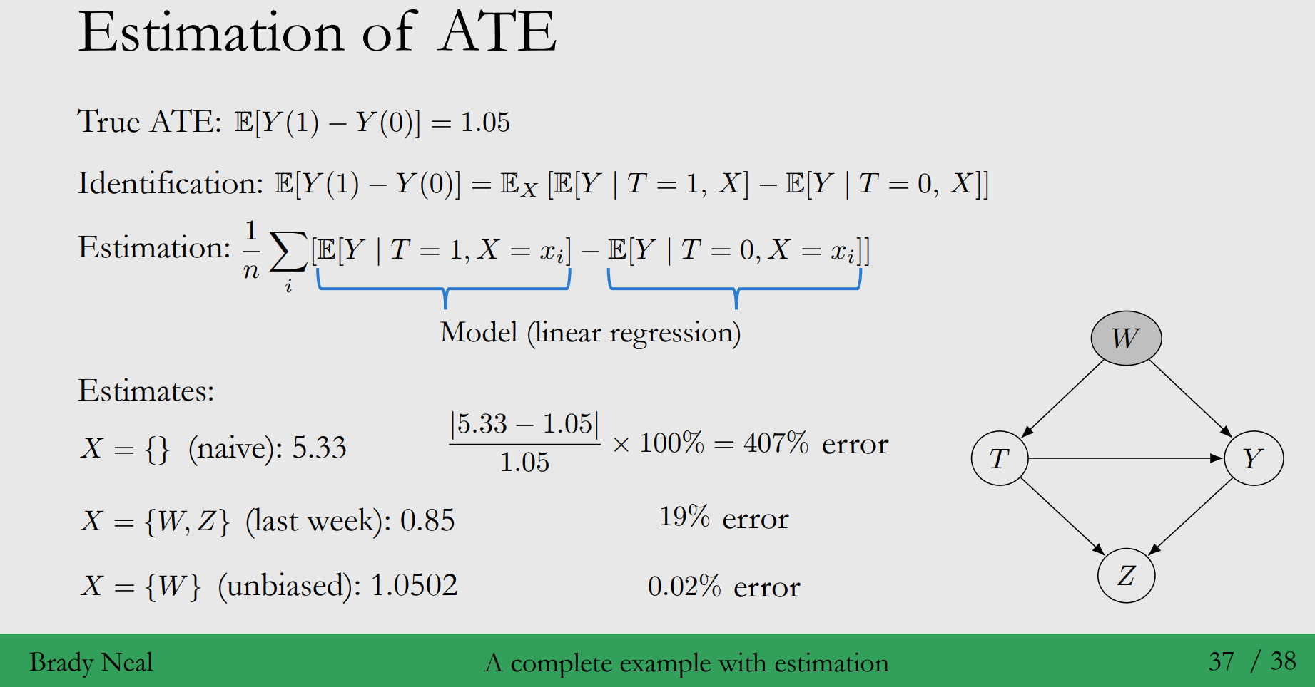 -Chapter 3에서 배운 방식으로 Statistical estimand를 작성해보면, $E_w,zE[Y|t,W]$ 이지만,colider인 $z$는 막을 필요가 없어요. 그래서 Causal graph를 통해 도출된 Statistical estimand는 $E_wE[Y|t,W]$입니다.