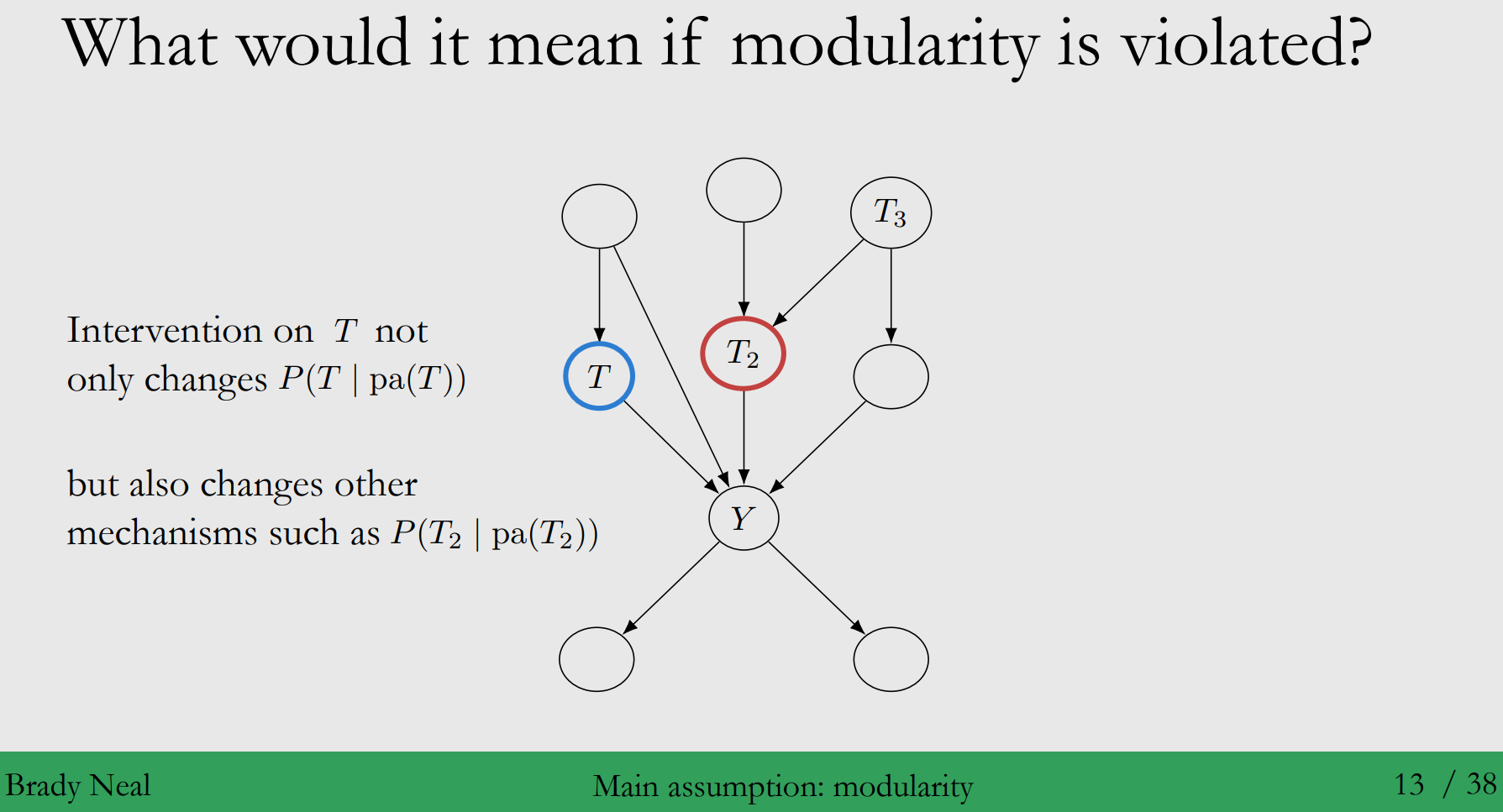 - 노드 $T$ 에 대한 개입(intervention)이 $T$의 부모 노드에 대한 영향력에 변화를 줄 뿐만 아니라, $T_2$의 부모 노드에 대해 변화를 주었을 때, "Intervention이 local이 아니다"라고 합니다.