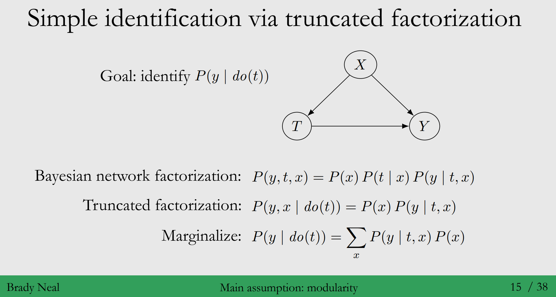 ◦ 예시 : $P(y|do(t))$를 Identify 해봅시다. →Treatment $T$에 영향을 미치는 부분이, 제거 (Trucated) 됩니다.