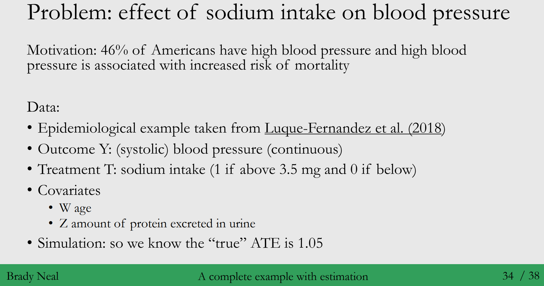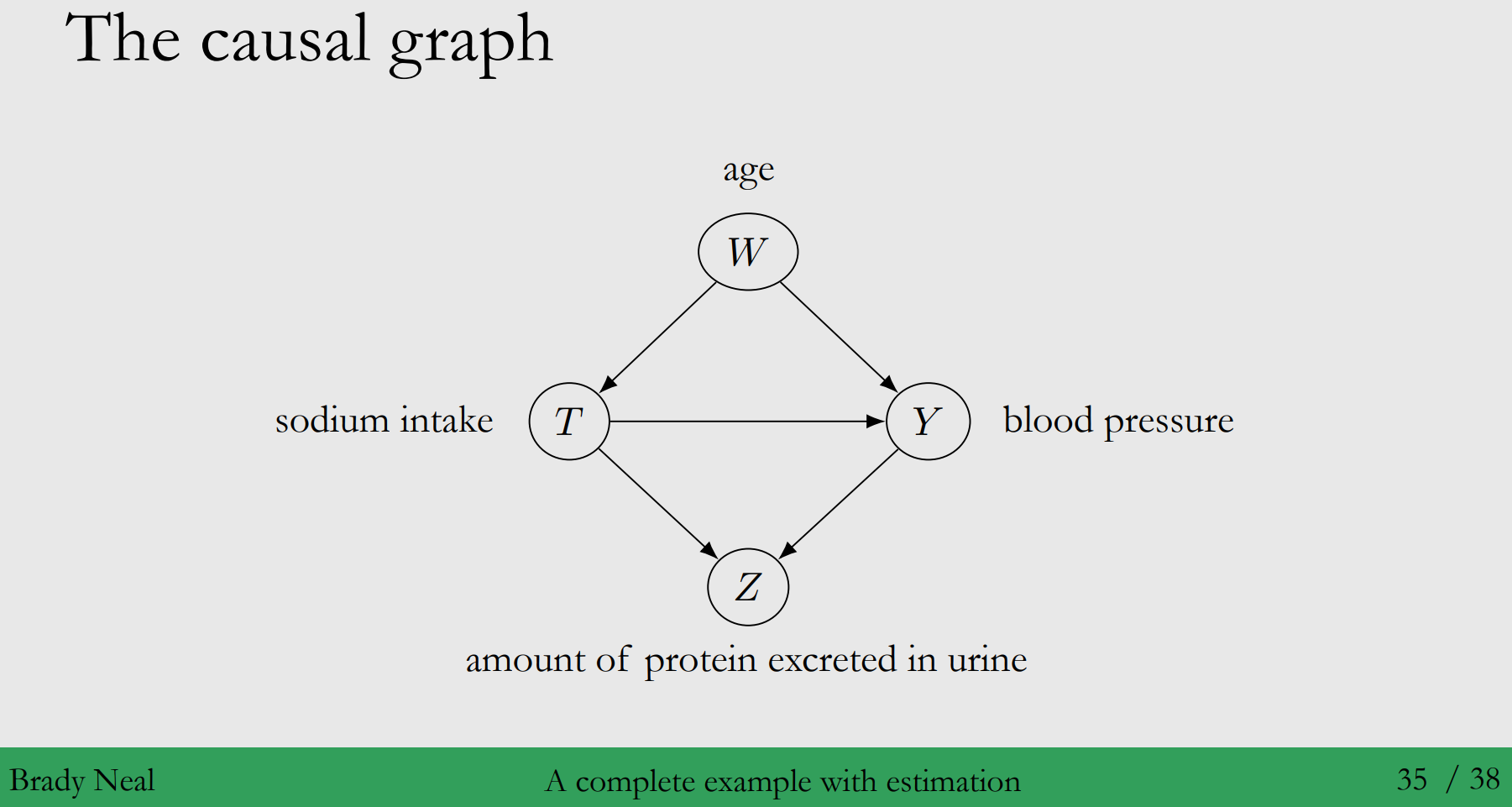 ◦ 데이터 설명 - 상황 : 미국인의 46%가 고혈압이 있고 고혈압은 사망률 증가와 연관되어 있습니다. - 가설 : 이때 나트륨 섭취가 고혈압에 영향을 줄까요? - Outcome : 혈압 - Treatment : 나트륨 섭취 - Covariates $W$ : 나이, Covariates $Z$ : 소변에 배출되는 단백질 양 → 나이는 혈압과 신체의 나트륨 수치를 조절하는 Confounder이며, 소변에 배출되는 단백질 양이 많은 것은 고혈압과 나트륨 섭취량이 많기 때문입니다. 즉, $Z$는 Colider이며 $W$는 Cofounder 입니다.