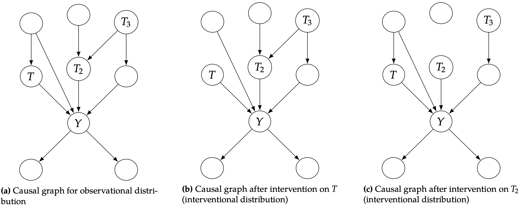 ◦ 예시 : (a) 개입이 없는 Observational distribution (b) $T$에 개입 : $T$의 부모 노드에서 오는 영향만 사라지고, 나머지는 유지됩니다. (c) $T_2$에 개입 : $T_2$의 부모 노드에서 오는 영향이 사라지고, 나머지는 유지됩니다. → $P(Y)$, $P(Y|do(T=t))$, $P(Y|do(T_2=t_2))$는 서로 연관되지 않은 완전히 다른 분포가 됩니다. → (b), (c) 처럼 edge가 제거된 그래프를 Manipulated graph라고 해요!