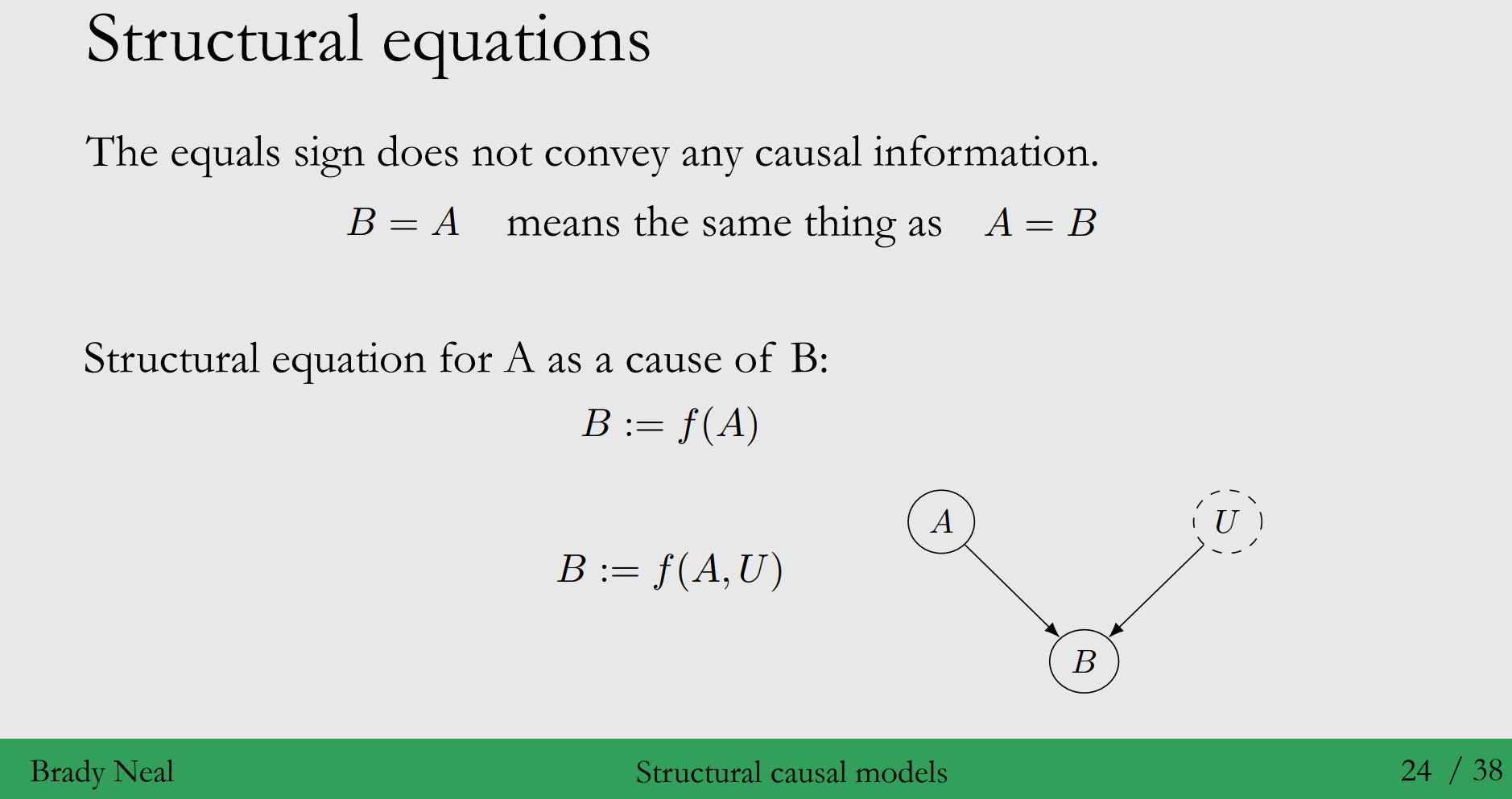 표현 : 수학에서 쓰는 ‘=’ 과는 달리, causation 상에서는 역이 성립하지 않으며, 아래와 같이 표기합니다. ◦ Structural equation B := f(A) ◦ 여기서 A와 B 의 mapping이 deterministic 합니다. 명확한 관계가 이외의 확률적인 부분 (Stochastic)을 고려하기 위해선 B의 unknown causes도 인지해야 해요. 그래서 해당 변수를 고려하면 아래와 같습니다. → B := f(A,U)