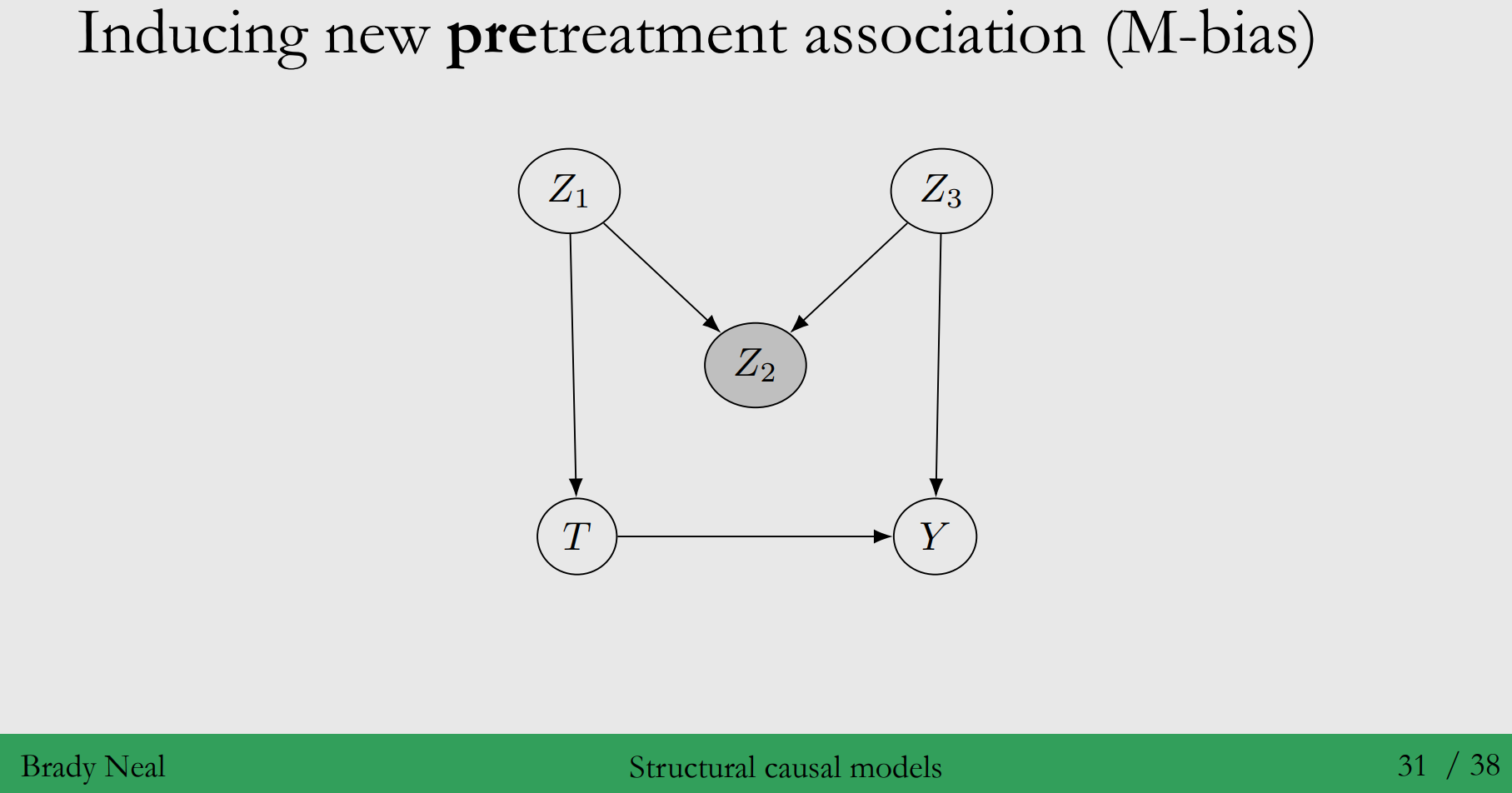3) 새로운 형태의 Association이 생기기 때문입니다 : new pre-treatment association < M-bias > ◦ 아래 그림에서도 $Z2$ 가 collider이므로, M-bias 형태에서 conditioning 시킬 수 없습니다.