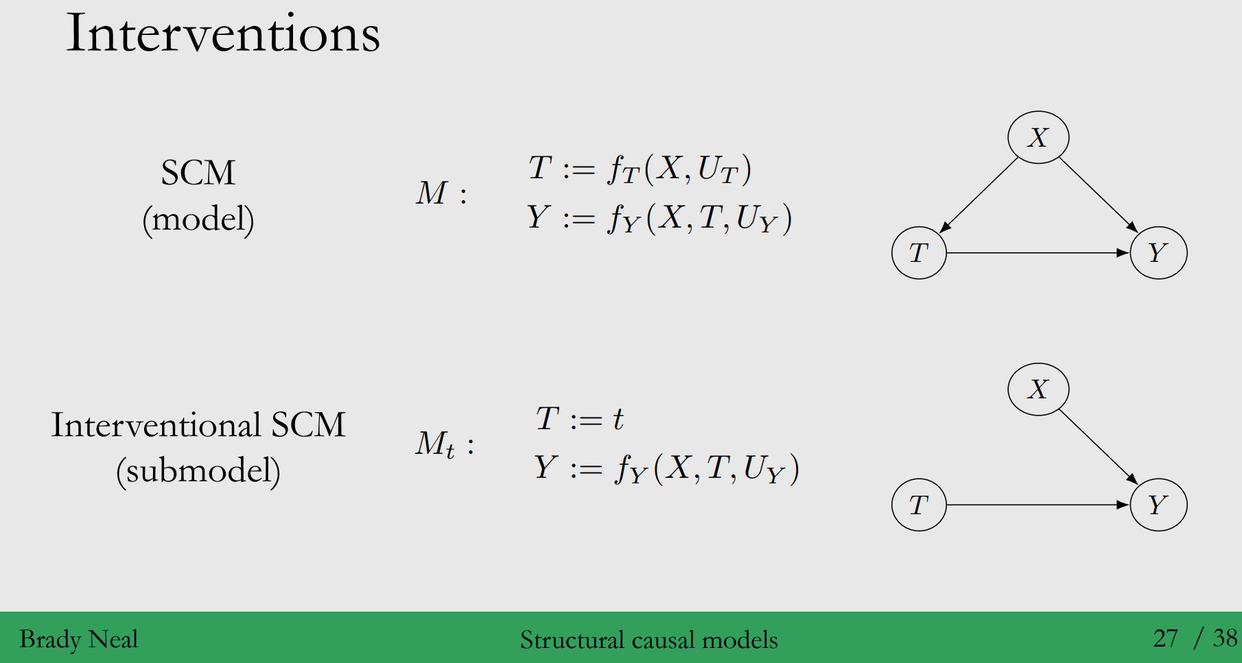 SCMs에서의 Intervention : Modularity assumption에 의해 SCM(M)과 Interventional SCM($M_t$)에는 $M_t$에서 개입이 일어나는 변수 $T$에 대한 구조방정식이 T:=t로 대체되는 것 외, 개입이 일어나지 않는 다른 변수에 대한 구조 방정식은 동일합니다.