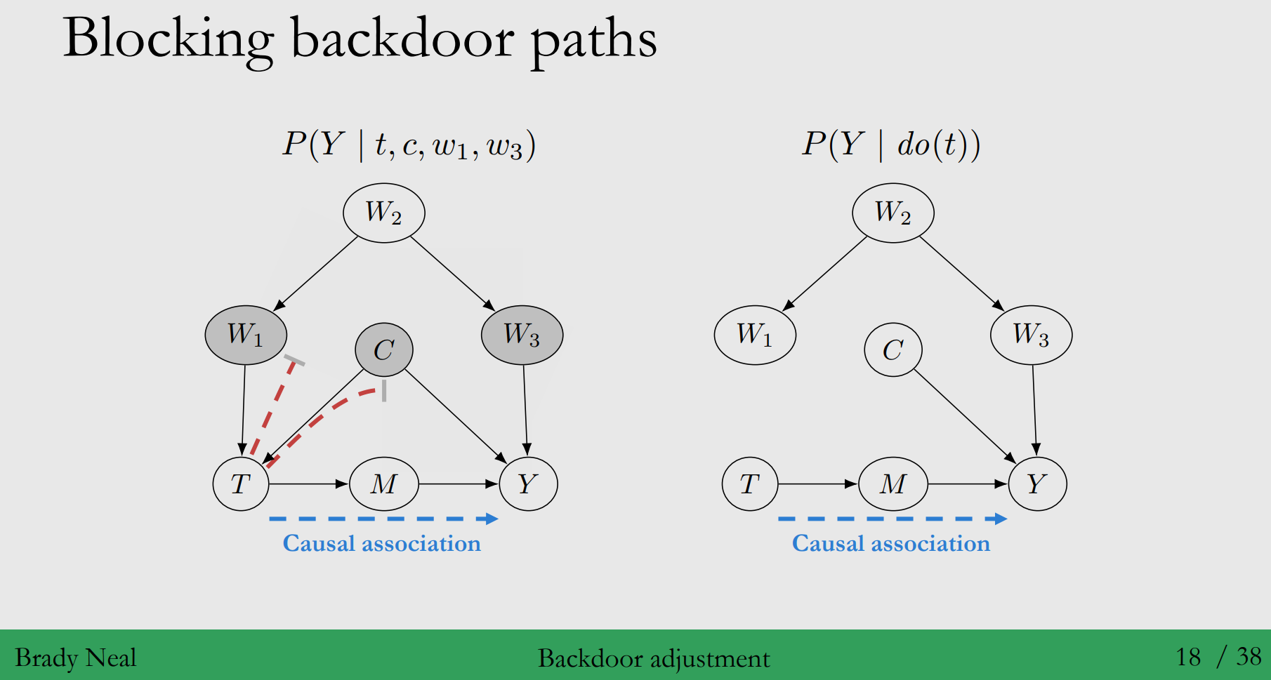 - 좌변 : $do(t)$의 modularity assumption에 의해 $T$에 들어오는 edge의 영향이 제거 - 우변 : $W$를 condition함으로써, $T$로 들어오는 edge의 영향을 제거