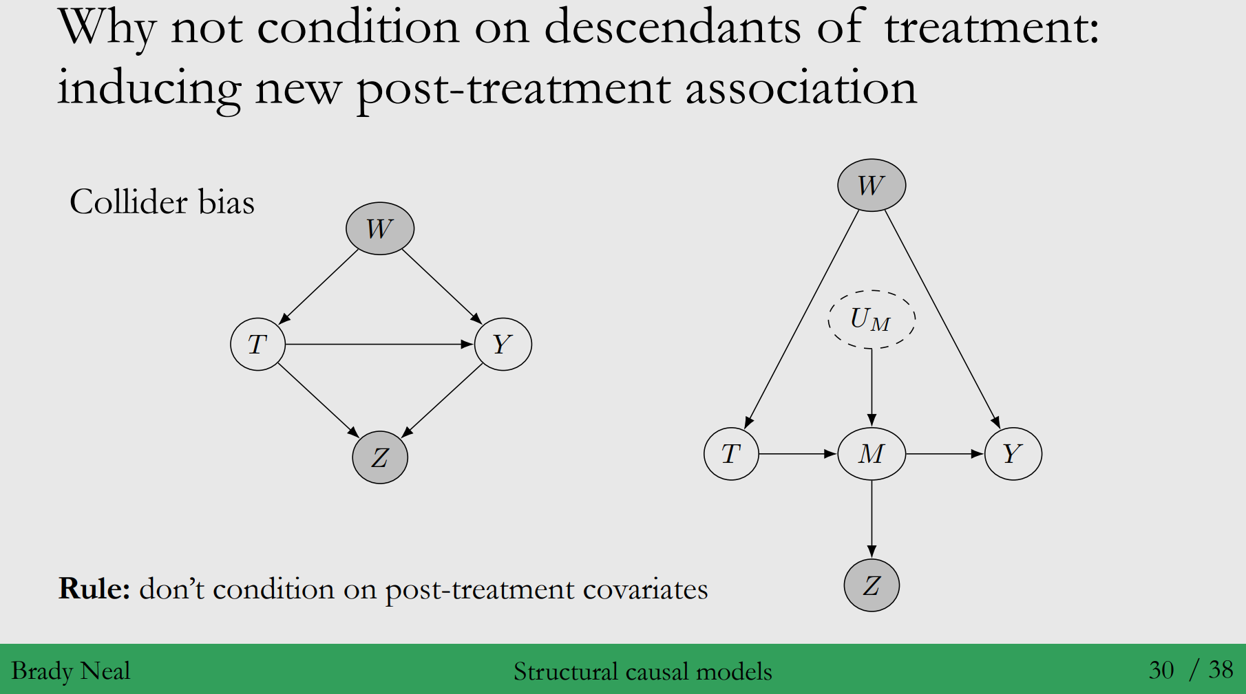 2) 새로운 형태의 Association이 생기기 때문입니다 : new post-treatment association ◦오른쪽 그림 : $M$에서 관측되지 않은 외생변수 $U_M$과 $T$, $M$사이엔 collider가 있다고 볼 수 있어요. →collider의 자식 노드인 $Z$를 condition하면, 새로운 post-treatment association이 발생할 수 있습니다!