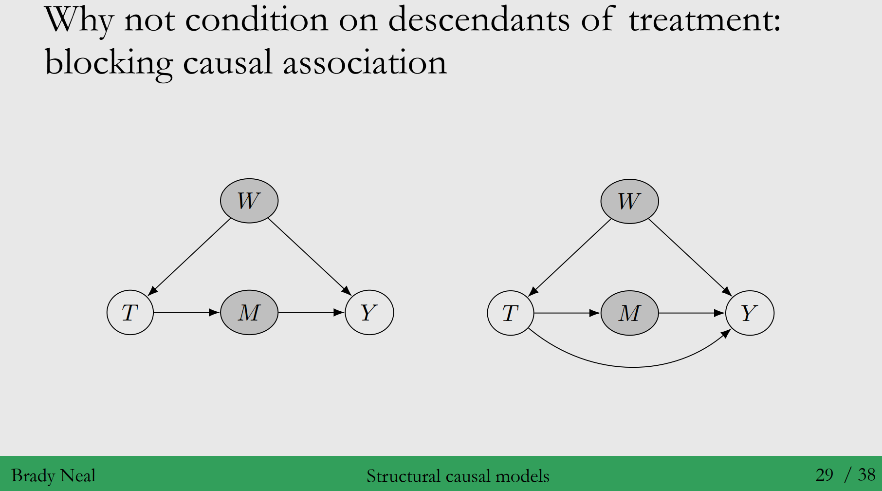 1) Causation을 막기 때문입니다. ◦ 왼쪽 그림 : 아래 그림은 $T$와 $Y$가 d-seperarted되어, 모든 causation이 막힌 상황입니다. ◦ 오른쪽 그림 : Causation이 있기 위해서는 $T$와 $Y$ 사이에 direct path가 있으면 됩니다. → 이러한 blocking causal association 이유로 descendants of treatment를 condition 하지 않습니다.