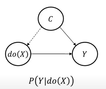 Do-operator를 적용하면, X에 영향을 주는 C→ X 사이의 연결고리를 그래프 상에서 이론적으로 없애는 것이며,이 상태에서 계산한 $P(Y|do(X))$ 값이 바로 인과 효과라는 것입니다.